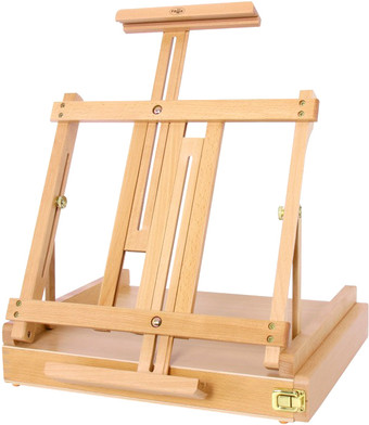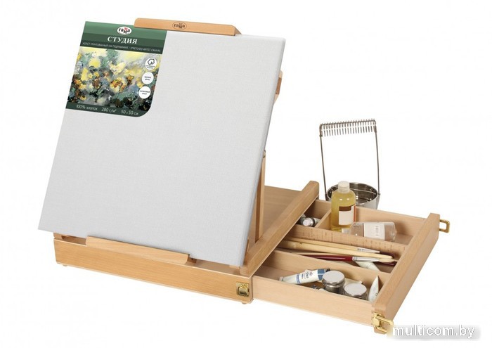 | Информация | ? Настольный этюдник с выдвижным ящиком для художественных материалов. ? Регулировка высоты верхнего фиксатора и нижней полки позволяет работать с большими форматами сидя. ? Складывается, снабжен ручкой для переноса — удобно хранить и брать с собой. |