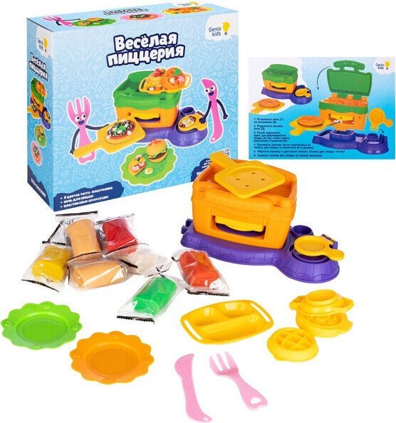 | Комплектация | Игрушечная печь для пиццы с прессом Подставка-поднос Лопатка для пиццы Нож для пиццы Вилка 3D формочки для лепки ингредиентов (огурцы, помидоры, грибы, перец и т.д. - указать конкретное количество и виды) 2 тарелки Тесто-пластилин – 8 блоков по 50 гр. (разных цветов) Инструкция по сборке |