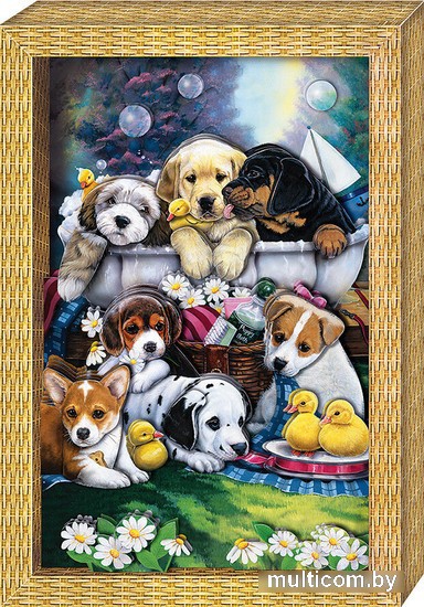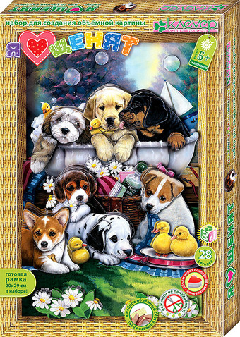 | Информация | Красочную картину "Я люблю щенят" ребёнок старше 5 лет с помощью взрослых сможет сделать сам – без клея и ножниц, в технике 3-D аппликации. Персонажи картины – забавные щенята-шалуны, которые купаются на зеленой лужайке вместе с пушистыми утятами. Работая с набором, ребёнок учится складывать трёхмерное изображение из частей, составляя перспективу. Рамку собирать не нужно – красочная и глубокая готовая рамка входит в набор. Клей также не нужен – вместо него в наборе объёмный двусторонний скотч. |