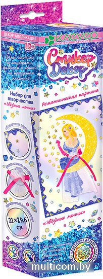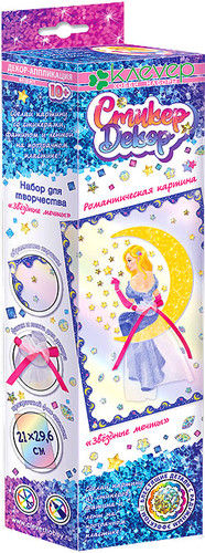 | Информация | Набор "Звёздные мечты" серии "Романтические картины" предлагает подростку старше 10 лет создать оригинальную картину из стикеров на прозрачном пластике, декорируя изображение гармонично сочетающимся с рисунком невесомым фатином и атласной лентой. Нежный сюжет - девушка в бальном платье на месяце среди сверкающих звёзд - передаёт романтическую атмосферу мечтательности и эффект невесомости. Изысканность сюжета сочетается с лёгкостью исполнения: по схеме наклеить на прозрачный пластик красочные детали-самоклейки и голографические стикеры, собрать на проволоку фатин и закрепить его на картине, завязать бант из ленты. |