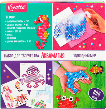 | Информация | С набором Аквамагия ваш ребенок сможет создать из разноцветных бусинок 7 потрясающих фигурок в виде жителей подводного мира. Расположите картинку-шаблон под прозрачную основу так, чтобы нарисованные на шаблоне бусины совпали с углублениями на основе. Соберите фигурку по шаблону, намочите все бусины водой из пульверизатора и оставьте на 1-2 часа до полного высыхания. За это время все бусинки склеятся между собой, образовав цельную фигурку. Необыкновенная поделка готова! Такое увлекательное занятие развивает у ребёнка мелкую моторику, аккуратность, усидчивость, умение работать по образцу и творческое мышление. В наборе Аквамагия Подводный мир 811 деталей: 800 разноцветных бусин (диаметр бусин - 5 мм; каждый цвет в отдельном пакетике), 4 карточки-шаблона со схемами 7-ми фигурок, 2 пластиковые основы, 2 цепочки для брелоков, бутылочка-распылитель для воды, пинцет, цветная инструкция в картинках. Материалы: пластик, картон, металл. |