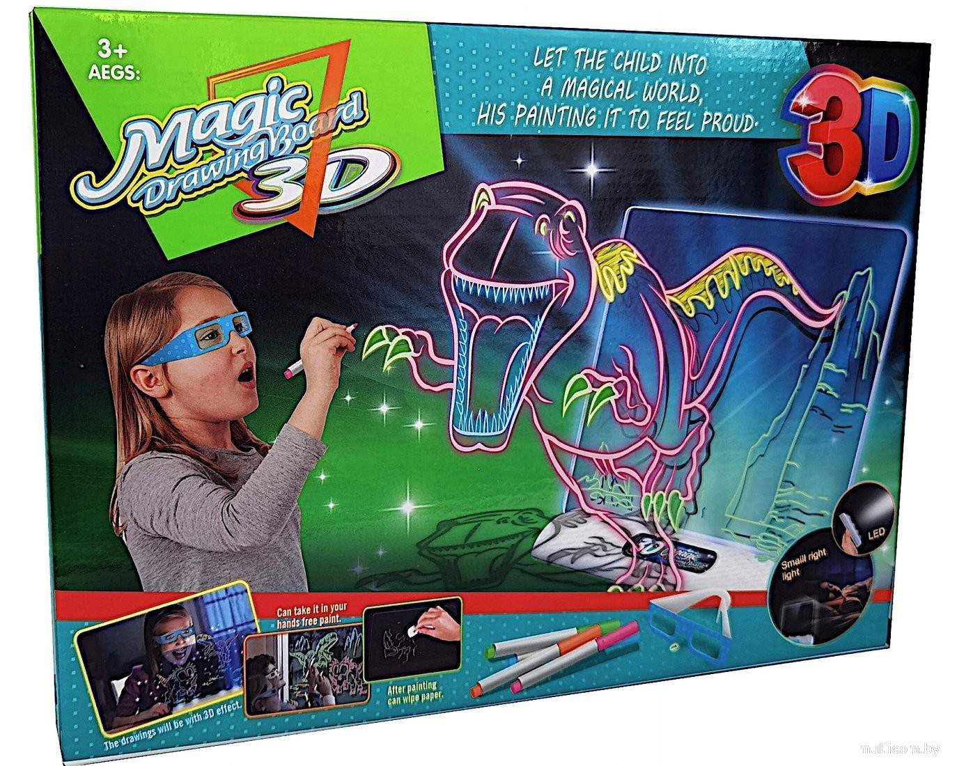 | Комплектация | маркер (4 шт.), салфетка, очки 3D, бумага (копировальная, с тематикой «динозавры» — 3 шт.) |