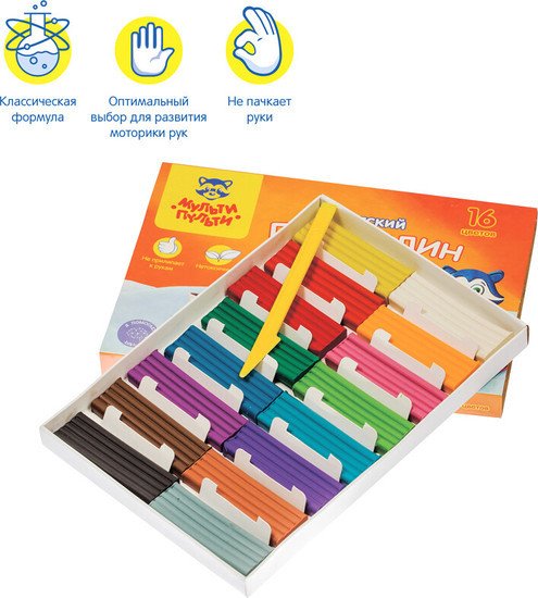 | Информация | Специальная формула сделала классический пластилин очень мягким. Он не липнет к рукам и не окрашивает их, хорошо держит форму поделки, не крошится при отрыве, из него можно делать мельчайшие детали. Яркие цвета, которые прекрасно смешиваются и склеиваются друг с другом. Предназначен для изготовления поделок и аппликаций из пластилина. |