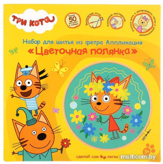 | Информация | Набор для творчества, аппликация для шитья из фетра «Три кота. Цветочная полянка» ТМ «МультиАрт»: - более 50 деталей - безопасная игла - любимые герои |