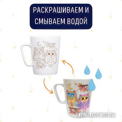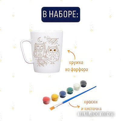 | Информация | На этой кружке изображены милые совята на ветке, так что она обязательно понравится всем любителям сов. Только посмотрите, какие интересные у них цветные перышки! Кружка-раскраска — удивительный набор для творчества и полезный подарок, который будет приятно использовать каждый день. Кружка, раскрашенная собственными руками, займет почетное место в коллекции. Кружка выполнена из качественного фарфора и очень приятная на ощупь. Краски и кисточка входят в комплект. При необходимости краску с кружки можно смыть и раскрасить заново. Если вы хотите, чтобы краска закрепилась, ей нужно дать высохнуть в течение 12 часов, а затем поставить кружку в духовой шкаф на 15 минут при температуре 120 градусов. Обратите внимание — не рекомендуется мыть кружку в посудомоечной машине или использовать агрессивные моющие средства. В наборе: кружка, краски, кисточка |