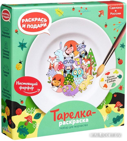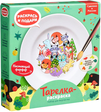 | Информация | Набор для творчества тарелка-раскраска – это отличный подарок, который позволит провести время с пользой. На тарелке в наборе уже нанесён рисунок – различные лесные зверьки, которые обязательно понравятся всем любителям животных. Раскрасьте их разными цветами и нарисуйте каждому разные пятнышки. В наборе есть всё необходимое для создания красивой декоративной тарелки: краски, кисточка, сама тарелка и деревянная подставка. Тарелка сделана из настоящего гладкого фарфора. После раскрашивания тарелку можно запечь в духовке, чтобы краска закрепилась, а затем поставить на полку в качестве украшения. Если вы смоете краску, то с этой тарелочки можно будет есть, ведь рисунки на ней даже без раскрашивания очень милые. |