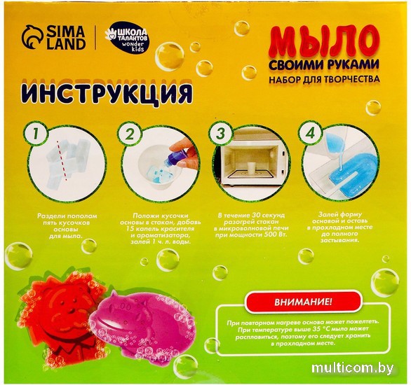 | Информация | ? Мыловарение — это удивительное занятие, которое развивает креативность, фантазию и мелкую моторику. ? С этим набором вы сможете создать ароматное мыло в домашних условиях. ? Результат вашего творчества можно использовать каждый день. ? Устройте творческий вечер для всей семьи, откройте коробку и приступайте к созданию шедевров. |