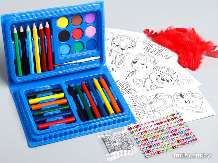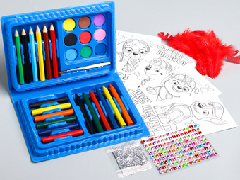 | Информация | В наборе: 6 карандашей; 12 восковых мелков; 9 красок; Кисть; 4 раскраски; Перья. |