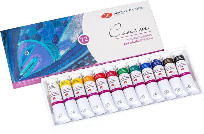 | Информация | Художественные акриловые краски «Сонет» - качественный и доступный по цене материал для начинающих художников. Акрил «Сонет» предназначен для живописи и декоративно-прикладного творчества. Краски выпускаются по современным рецептурам. Отличаются яркостью и чистотой цвета, легко смешиваются с водой. Наносятся на бумагу, картон, грунтованный холст, дерево, металл, кожа, ткань. При высыхании образует эластичную несмываемую матовую пленку. Сбалансированная палитра в наборе акриловых красок «Сонет» состоит из 12 цветов, необходимых начинающему художнику для выполнения учебных работ, этюдов и эскизов. |