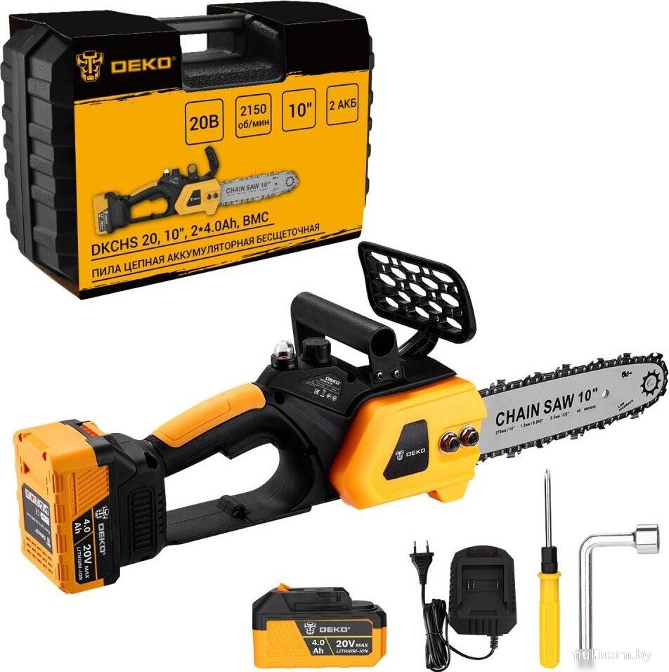 | Комплект поставки | - Пила (основной корпус) - 1 шт. - Аккумулятор 4,0 Ач - 2 шт. - Зарядное устройство - 1 шт. - Шина - 1 шт. - Цепь - 1 шт. - Дополнительная рукоятка - 1 шт. - Защитный щиток - 1 шт. - Отвертка - 1 шт. - Торцевой ключ - 1 шт. - Руководство по эксплуатации - Кейс |