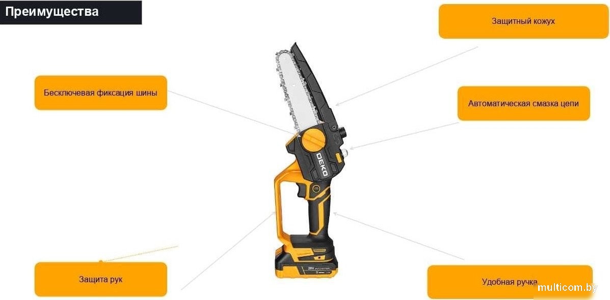 | Информация | - Аккумуляторная цепная пила DEKO DKCHS 20-6 — идеальный помощник для выполнения различных задач в мастерской и саду. С её помощью легко распиливать древесину и пластмассу, что делает её универсальным инструментом для домашних мастеров и профессионалов. - Пила оснащена мощным литий-ионным аккумулятором на 20В и двумя батареями по 3.0Ач, что обеспечивает длительное время работы без подзарядки. Это особенно удобно для тех, кто ценит эффективность и мобильность в своих проектах. - Благодаря компактному дизайну и легкому весу, DEKO DKCHS 20-6 легко управляется одной рукой, что позволяет выполнять точные пропилы даже в труднодоступных местах. Инструмент идеально подходит для дачников и садоводов, которые хотят быстро и качественно обрабатывать древесину. - Не забывайте о безопасности при работе с цепной пилой: используйте защитные очки и перчатки. - С этой пилой вы сможете легко справляться с любыми задачами, будь то обрезка веток, распиловка бревен или создание деревянных конструкций. DEKO DKCHS 20-6 — это надежный инструмент, который станет незаменимым в вашем арсенале. |