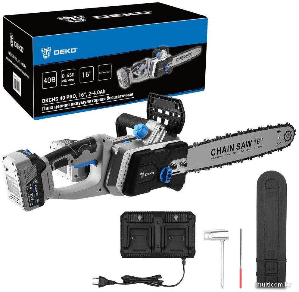 | Комплект поставки | - Пила аккумуляторная - 1 шт. - Пильная шина - 1 шт. - Цепь - 1 шт. - Аккумулятор 4,0 Ач - 2 шт. - Двойное зарядное устройство - 1 шт. - Защитный кожух шины - 1 шт. - Ключ - 1 шт. - Инструкция - Коробка |