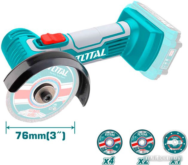 | Комплектация | Пила циркулярная аккумуляторная TOTAL TAGLI7601 - 1 шт. Диск отрезной для пилы 76 мм - 4 шт. Диск шлифовальный для пилы 76 мм - 2 шт. Диск алмазный для пилы 76 мм - 1 шт. Шестигранный ключ - 1 шт. Коробка Поставляется без аккумулятора и зарядного устройства! |