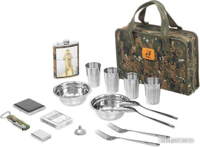 | Состав набора | • Фляжка 1 шт.- 270мл. • Тарелка 2 шт.- 350мл. • Стопка 4 шт.150мл. • Ложка - 2 шт. • Вилка - 2 шт. • Воронка - 1 шт. • Мультитул - 1шт. • Набор игральных карт - 1 шт. • Зажигалка - 1 шт. • Портсигар - 1 шт. • Сумка-чехол для хранения и переноски - 1 шт. |