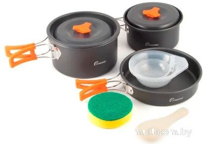 | Состав набора | Кастрюля - 1,5 л (? 160х85 мм) Кастрюля - 0,8 л (? 135х75 мм) Сковорода - 0,7 л (? 170x45 мм) Деревянная лопатка, губка для мытья посуды, складной половник, пластиковые миски - 3 шт., чехол |