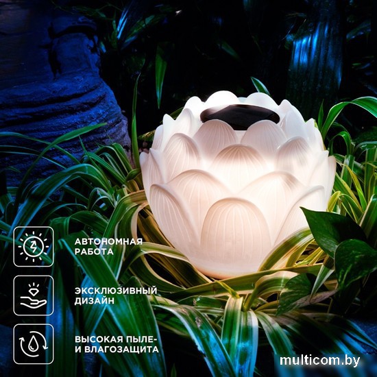 | Информация | ? Садовый светильник-фигура Rexant Лотос 602-2431 - изысканный элемент садового декора для дополнительного освещения или акцентной подсветки. ? Вдохновлен элегантностью и загадочностью восточных садов Пекина, светильник выполнен в виде крупного цветка лотоса, символизирующего чистоту, красоту и духовное просветление. ? Изысканные контуры и детали создают неповторимый образ, привлекающий внимание как днем, так и ночью. ? Оснащен солнечной панелью, которая поглощает солнечные лучи и преобразует их в электрическую энергию. ? Автономно функционирует около 6-8 часов и освещает окружающую территорию вечером и ночью. |