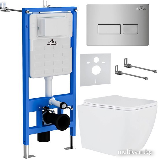 | Информация | Комплект инсталляции 6 в 1 Roxen StounFix Slim 592045 с удлиненными креплениями в комплекте, шумоизоляционной плитой, кнопкой смыва Roxen Caspia 410280CH ?и подвесным унитазом Roxen Cube 530135-01 Rimless Soft Close. Система инсталляции для унитаза Roxen StounFix Slim 710200 - надежная усиленная ультратонкая модель для максимальной экономии свободного пространства. Оптимальная выверенная монтажная глубина 120 мм позволяет создать необходимое давление в смывном бачке для максимально мощного смывного потока воды! Инсталляция Roxen StounFix Slim выполнена из высокопрочной стали и покрыта специальной порошковой краской, методом автоматического вакуумного напыления. Бачок защищен дополнительной шумоизоляционной пластиной S-Protect, которая предотвращает образование конденсата и плесени. Механическое управление смыва обеспечивает бесперебойную работу на весь срок службы. Инсталляция комплектуется удлиненными креплениями Plattenbau (при помощи удлиненных шпилек 50 см), что позволит вам без проблем отрегулировать необходимую монтажную глубину. Особенности инсталляции: усиленная монтажная рама выдерживает до 400 кг нагрузки, при испытуемой нагрузке 800 кг ультратонкий монтаж - монтажная глубина 120 мм подходит для всех типов унитазов (18 см, 23 см) удлиненные крепления механическое управление смыва цельнолитой бачок выполнен из высококачественного пластика HDPE шумоизоляционная пластина S-Protect, предотвращает образование конденсата и плесени объем бачка: 3/6 л расширенное ревизионное окно для быстрого и легкого доступа к сливной арматуре тихое наполнение бачка 2-х режимная система смыва шумоизоляционная плита латунный запорный вентиль гарантия производителя 25 лет Кнопка для инсталляции Roxen Caspia 410280CH - ультратонкая смывная клавиша Slim Button (толщина - 8 мм). Стильный минималистичный дизайн с удобными прямоугольными клавишами придаст вашему санузлу изящный внешний вид. Кнопка изготовлена из ударопрочного, экологически чистого ABS пластика марки HDPE, имеет нестираемое покрытие поверхности. Быстросъемная система Easy Fix обеспечивает быстрый доступ к коммуникациям (монтаж и демонтаж клавиши осуществляется без специального инструмента). Надежный механизм клавиши рассчитан на 200 000 циклов. Характеристики клавиши смыва: цвет: хром глянцевый ширина, мм: 246 высота, мм: 165 толщина, мм: 8 управление: механическое материал: пластик HDPE ударопрочная нестираемое покрытие поверхности специальное антибактериальное покрытие Purity бесшумная двухрежимная система смыва LightTouch быстросъемная система Easy Fix для быстрого доступа к коммуникациям Подвесной унитаз Roxen Cube 530135-01 Rimless Soft Close - стильная модель с удобной безободковой чашей Pro-Rimless, благодаря чему нет труднодоступных зон для уборки. Инновационная конструкция чаши унитаза позволяет избежать попадания брызг воды при смыве. Изготовлен из санитарного фарфора Porcelain, который обеспечивает прочность изделия, белизну, абсолютно гладкую поверхность, отсутствие пор и углублений. Специальное антибактериальное покрытие Ultra Glide обеспечивает легкий уход, гигиеничность и первоначальный внешний вид на долгие годы. Модель укомплектована тонким быстросъемным сиденьем с крышкой Soft Close (плавное опускание). размер (ГхШхВ), мм: 515х365х350 высота от пола, мм: 400-420 материал: санитарный фарфор антибактериальное покрытие безободковая чаша круговое омывание чаши дюропластовое быстрос
