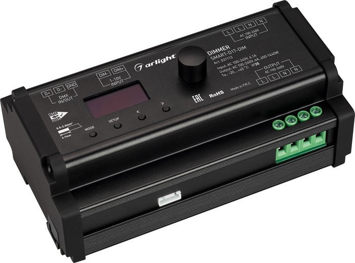 | Информация | Диммер для одноцветных источников света (TRIAC). Питание/рабочее напряжение 100-240V AC, выходной ток 6А, выходная мощность 600-1440W. Корпус - PVC, OLed экран. Габариты 168х93.5х63 мм. Управляется пультами и панелями серии SMART, поддерживающими диммирование по радиоканалу (см. совместимые), входы DMX512 и 0/1-10V, на корпусе - аналоговый вращатель. |