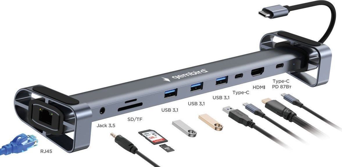 | Все разъемы на адаптере | USB-A 3.2 Gen1 (5 Гбит/с), HDMI, RJ-45, USB-C (только для зарядки), 3.5 мм jack |