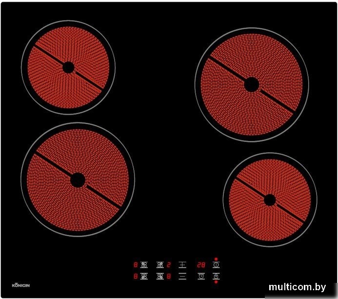| Подробная информация о конфорках | Фронтальная левая зона ? 200 мм - 1800 Вт; фронтальная правая зона ? 165 мм - 1200 Вт; задняя левая зона ? 165 мм - 1200 Вт; задняя правая зона ? 200 мм - 1800 Вт |