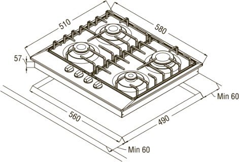 | Подробная информация о конфорках | Экономичная конфорка (1 кВт): 1 Стандартная конфорка (1,75 кВт): 1 Конфорка HighSpeed (3 кВт): 1 WOK конфорка с тройным рядом пламени (3,6 кВт): 1 |