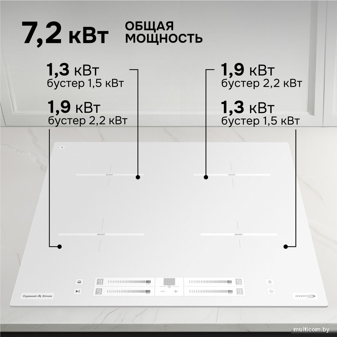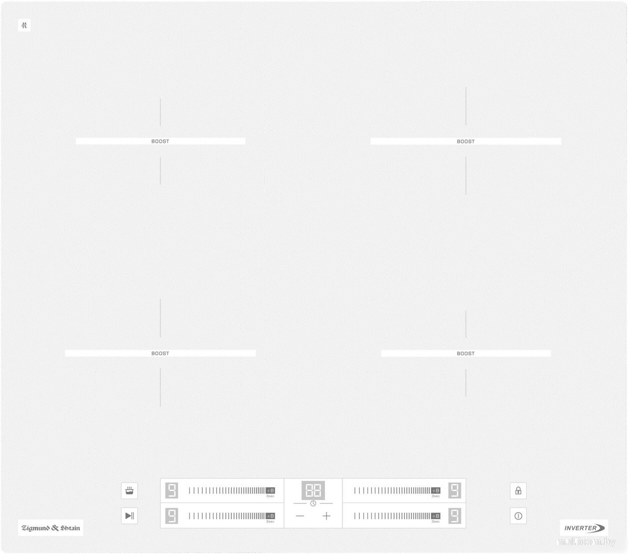 | Подробная информация о конфорках | Ближняя левая 180 мм, 1900/2200 Дальняя левая 160 мм, 1300/1500 Дальняя правая 180 мм, 1900/2200 Ближняя правая 160 мм, 1300/1500 |