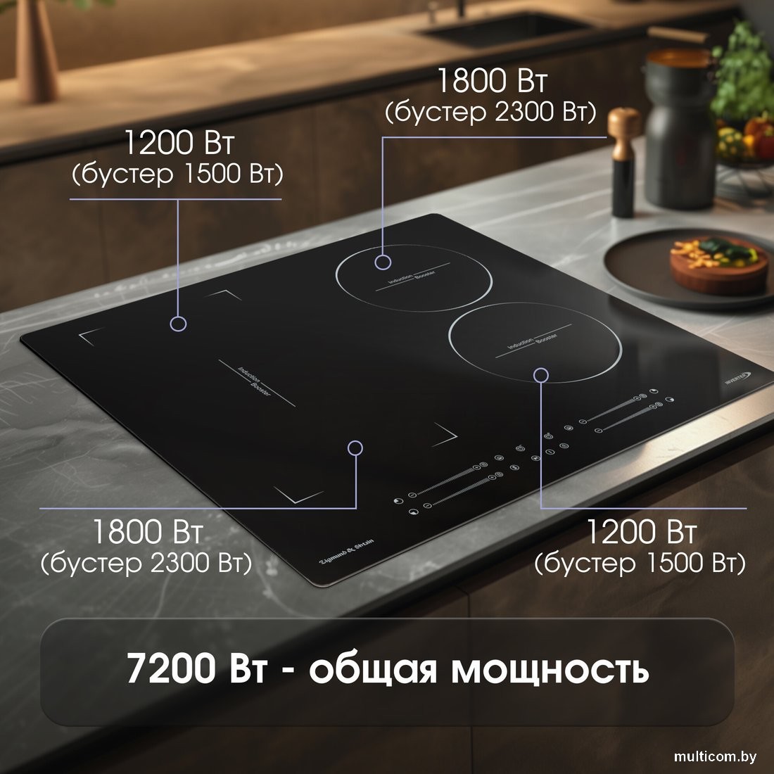 | Подробная информация о конфорках | Ближняя левая 180 мм, 1800/2300 Дальняя левая 160 мм, 1200/ 1500 Левая Flex-зона 190*385 мм, 3000/3600 Дальняя правая 180 мм, 1800/2300 Ближняя правая 160 мм, 1200/ 1500 |