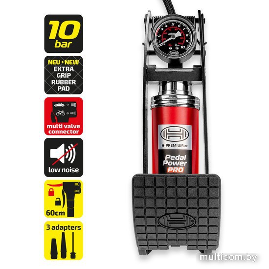 | Информация | Премиальный ножной насос Pedal Power HEYNER® с одним цилиндром легко справляется с накачиванием автомобильных, велосипедных шин и мячей. Усовершенствованный насос оснащен мультивентильным соединением для клапанов авто- и велошин, в том числе шин горных велосипедов, а также французских клапанов или клапанов Presta. Поверхность педали теперь покрыта улучшенной нескользящей накладкой, что позволяет ещё комфортнейо накачивать шины. Резиновые ножки насоса улучшены и обеспечивают ещё большую стабильность в процессе накачивания. Рабочее давление прибора - 7 Бар, манометр с регулируемой красной отметкой всегда безошибочно показывает давление в шинах. Манометр имеет резиновую покрышку, что защищает его от механических повреждений. Цилиндр и рама насоса особо прочные благодаря использованию в их производстве сверхкачественной стали. Длина пневматического шланга - 60 см, в комплекте прилагаются три адаптера: один - для мячей и два - для надувных матрасов и подобных предметов. Размеры насоса - 285x100x90 мм, он выполнен в красных и черных цветах. |