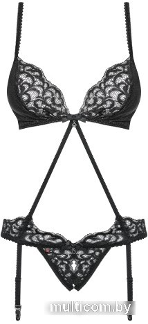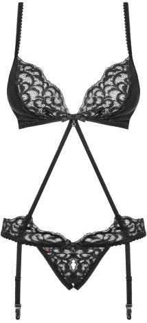 | Информация | Детали: многоступенчатая застежка на спине и регулируемые бретельки - бюстгальтер подойдет идеально, материал на груди с блестящими частичками и кружевными вставками - красиво подчеркнутая грудь, ювелирные подвески с черными камнями и декоративными бантами - элегантные детали, два сексуальных ремешка, соединяющие верхнюю и нижнюю части, съемные бретели для чулок - больше возможностей, деликатная суперэластичная ткань Multistretch, открытая промежность и пикантные вырезы на ягодицах - будет жарко! |