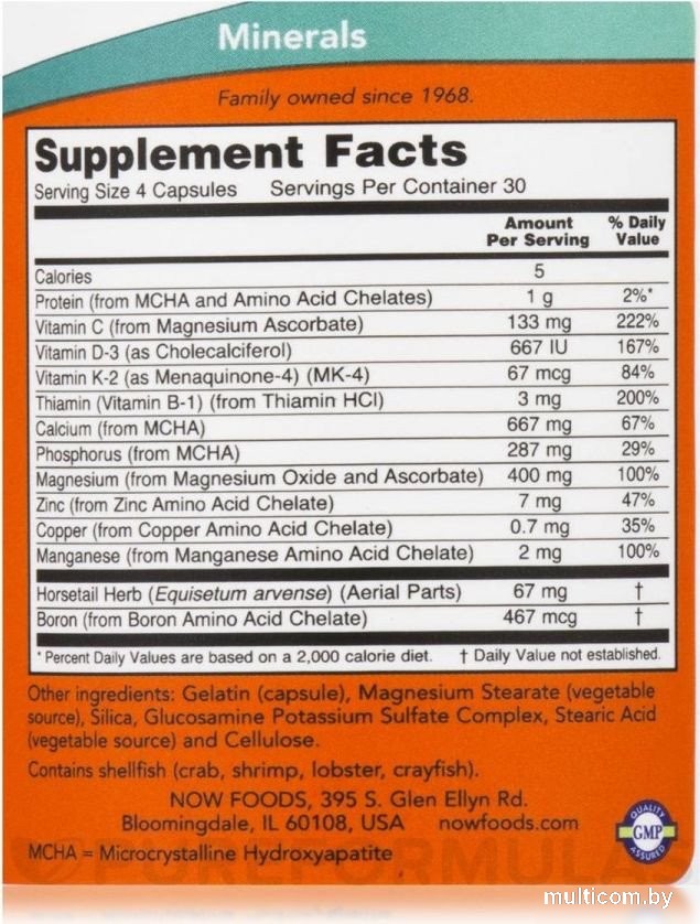 Информация | - Если вам нужно обеспечить организм оптимальным количеством кальция, высокой прочностью костной ткани, отличным состоянием костей и суставов при регулярных физических нагрузках и тренировках, рекомендуем приобрести активную добавку от компании "НАУ Фудс" - Bone Strength. - Капсулы препарата характеризуются богатым составом соединений (витамины, минералы, растительные элементы), необходимых для здоровья и функциональности опорно-двигательного аппарата. Уникальная формула обеспечивает эффективность воздействия продукта. Активная пищевая добавка "Крепкие кости" 120 капсул обладает большим перечнем полезных свойств. - Функции и полезное действие Bone Strength - Витамины Bone Strength в форме капсул, помимо укрепления костей, улучшают проницаемость сосудистых стенок. Они положительно влияют на свёртываемость крови, повышают устойчивость к вирусам и инфекциям. Применение капсул с большим содержанием витаминов и минералов позволяет подавить воспалительные процессы и отрегулировать обменные процессы. Биодобавка Bone Strength от NOW Foods характеризуется следующими полезными свойствами: - укрепляет костную ткань, - препятствует вымыванию минеральных соединений; - нормализует микроциркуляцию; - балансирует углеводный обмен; - улучшает свёртывание крови; - оздоравливает сердце; - оказывает положительное влияние на работу нервной системы; - выводит токсины, тяжёлые металлы и продукты распада; - улучшает функции мышц, способность ткани к сокращению. - Микроэлементы, которые содержатся в капсулах "Крепкие кости", регулируют работу поджелудочной железы, нормализуют функции щитовидной железы, активизируют синтез коллагена и эластина. - Зачем принимать Now Foods Bone Strength (120 капс) - Комплекс витаминов и минералов для костей рекомендован к использованию лицам, которые активно занимаются спортом, регулярно подвергают себя интенсивным физическим нагрузкам. - Показаниями для применения являются: переломы и травмы костей, дефицит кальция, нарушения минерального обмена, работы сердца, сосудов, нервной системы, склонность к появлению синяков и к отрытым кровотечениям, болезненные менструации, климакс. - Использовать капсулы Vitamins Bone Strength необходимо при ослабленном иммунитете, сахарном диабете, экземе и дерматите, при аллергических реакциях, повышенном уровне глюкозы. |