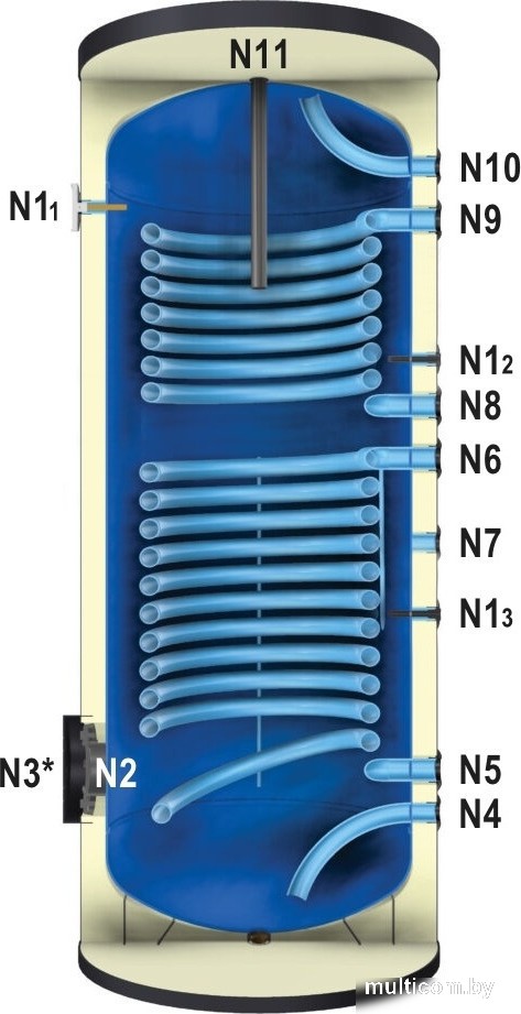 | Информация | - Бойлер косвенного нагрева Huch EnTEC TBA-D200 предназначен для приготовления горячей воды от 2-ух внешних источников. - Водонагреватели серии TBA-D доступны в объемах 150–500 л и оснащаются защитным магниевым анодом. - Они оборудованы двумя гильзами для установки датчика температуры и фланцем для ревизии и очистки. - В ревизионном фланце N3 расположено дополнительное отверстие N2 (заглушка). |