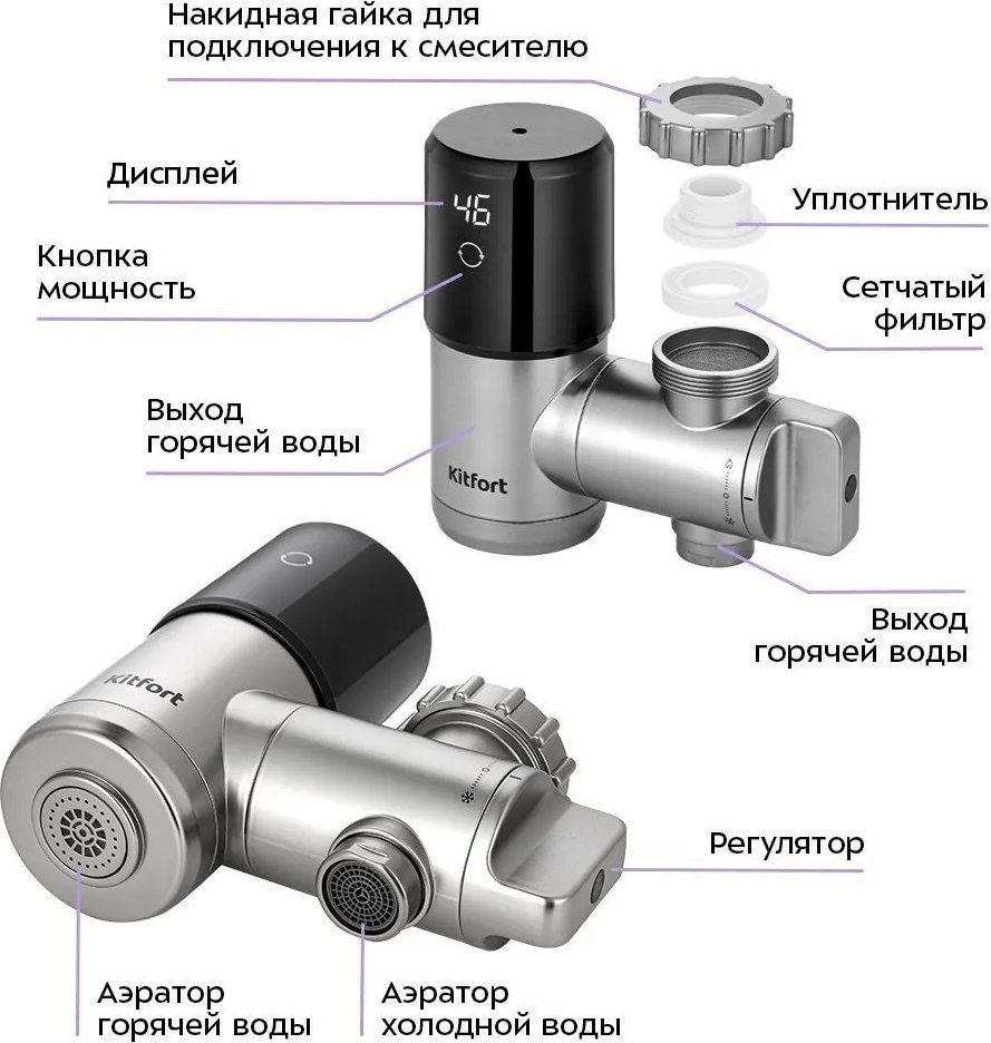 | Информация | - Отключение горячей воды больше не станет для вас проблемой! Проточный электрический водонагреватель Kitfort KT-6526 идеально подходит для быстрого нагрева холодной воды, обеспечивая комфорт в вашем доме. Компактные размеры устройства позволяют легко разместить его на кухне или в ванной, не занимая много места. - Нагрев воды осуществляется с помощью надежного ТЭНа, который быстро поднимает температуру воды до 70 °C. В отличие от накопительных водонагревателей, вам не придется ждать, пока бойлер нагреется — горячая вода будет доступна мгновенно. - Удобство в управлении — это то, что отличает КТ-6526. Устройство предлагает три уровня мощности нагрева, а текущая температура и уровень мощности отображаются на дисплее. Обратите внимание, что напор воды также влияет на температуру: при меньшем напоре вода будет горячее. - Простота использования — еще одно преимущество водонагревателя КТ-6526. Он оснащен двумя выходами для горячей и холодной воды с отдельными аэраторами, а также имеет отверстие для слива и место для подключения к смесителю. Сетчатый фильтр и накидная гайка обеспечивают надежное соединение. - Легкий монтаж — это еще один плюс! Устройство легко устанавливается на смеситель вместо аэратора, а в комплекте вы найдете муфты для смесителей разных диаметров, от 20 до 24 мм. С Kitfort KT-6526 вы всегда будете уверены в наличии горячей воды, что делает его отличным выбором для вашего дома! |