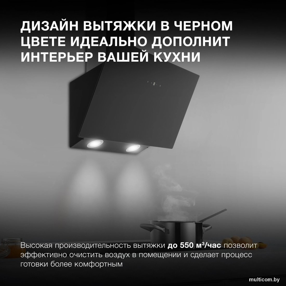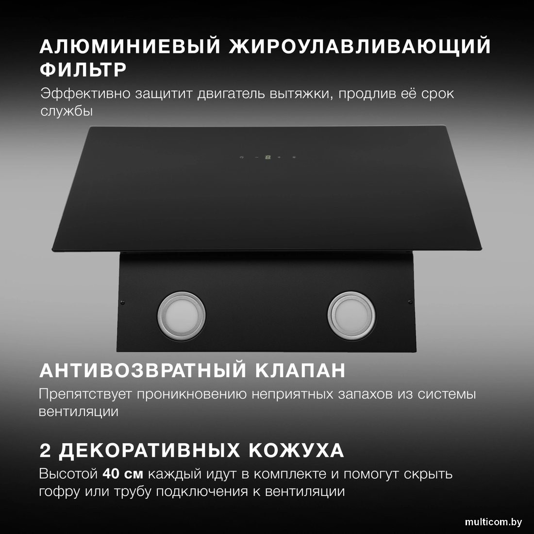 | Информация | - Сочетание металла и стекла придаёт вытяжке привлекательный внешний вид, а интуитивное управление через сенсорную панель делает использование удобным. - Мощность подключения 123 Вт обеспечивает стабильную производительность до 550 м3/час, при этом устройство расходует энергию максимально экономно. - Алюминиевый фильтр с жироулавливающими свойствами и антивозвратным клапаном обеспечивает эффективную очистку воздуха, а также легко моется в любом средстве от жира. - В комплекте с вытяжкой поставляются 2 декоративных кожуха по 40 см и гофра для организации воздушного потока. |