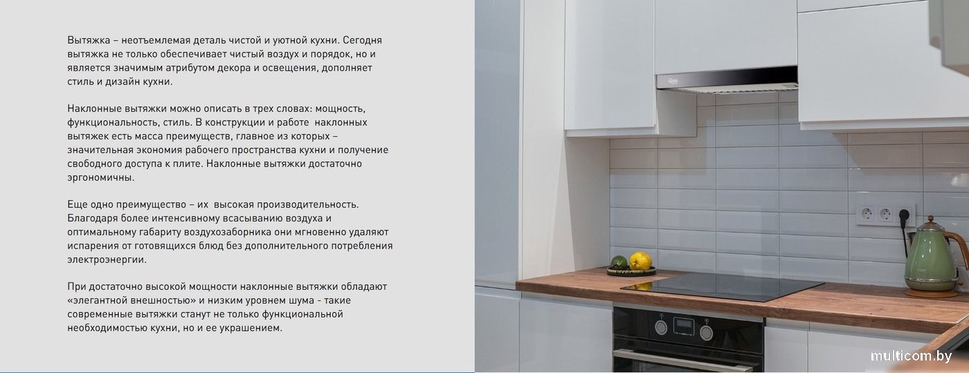 | Информация | - Вытяжка – это ключевой элемент для создания чистоты и уюта на вашей кухне. Она не только очищает воздух и поддерживает порядок, но и служит важным элементом декора, подчеркивая стиль и дизайн вашего пространства. - Наклонные вытяжки можно охарактеризовать тремя словами: мощность, функциональность и стиль. Их конструкция предлагает множество преимуществ, среди которых главное – экономия рабочего пространства и удобный доступ к плите. Эти вытяжки отличаются высокой эргономичностью. - Еще одним значительным плюсом является их высокая производительность. Благодаря интенсивному всасыванию и оптимальным размерам воздухозаборника, они эффективно удаляют испарения от готовящихся блюд, не увеличивая потребление электроэнергии. - При впечатляющей мощности наклонные вытяжки также радуют «элегантным дизайном» и низким уровнем шума. Они станут не только необходимым функциональным элементом, но и стильным украшением вашей кухни. - Мощный поток воздуха обеспечивает отличную производительность. - Сенсорное управление с ярким дисплеем делает использование вытяжки простым и удобным. - Эргономичная система освещения LED создает комфортную атмосферу на кухне. - Надежный алюминиевый жироулавливающий фильтр гарантирует чистоту воздуха. - Антикоррозионный прочный корпус обеспечивает долговечность и надежность. - Таймер с функцией автоматического отключения добавляет удобства и безопасности в использовании. |