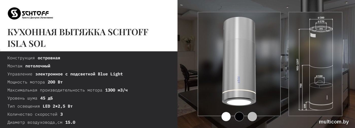 | Информация | Продуманная конструкция вытяжки обеспечивает максимальную производительность и эффективное удаление неприятных запахов и паров, возникающих при готовке. Вытяжка может быть установлена по всему периметру кухни и в центре, позволяя максимально удобно сделать расстановку мебели и техники. Она идеально подойдет для любого интерьера и стиля кухни. |