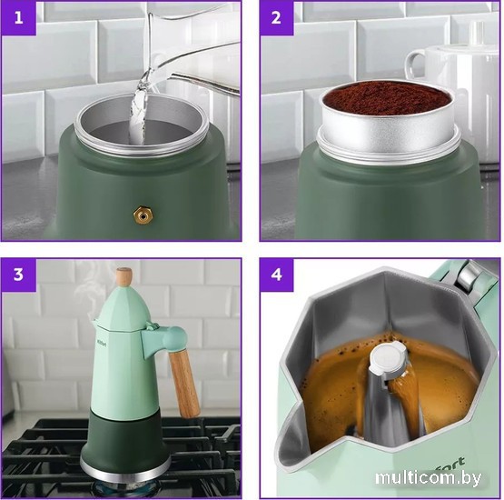 | Информация | ? Простой способ приготовления. ? Кофе не убежит! ? Гейзерная кофеварка КТ-7154 подходит для использования на газовых, электрических и инфракрасных плитах. Рекомендуется включать плиту на среднюю мощность при заваривании кофе. ?? Быстро разбирается, легко очищается. ? Яркий дизайн! |